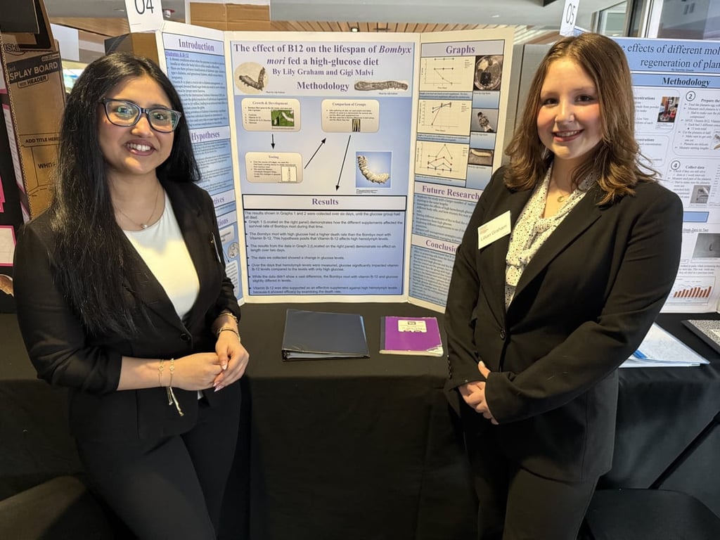 - Grade 10 students Lily Graham and Gigi Malvi presented their project, “The Effect of B12 on the Lifespan of Bombyx mori Fed a High-glucose Diet.”