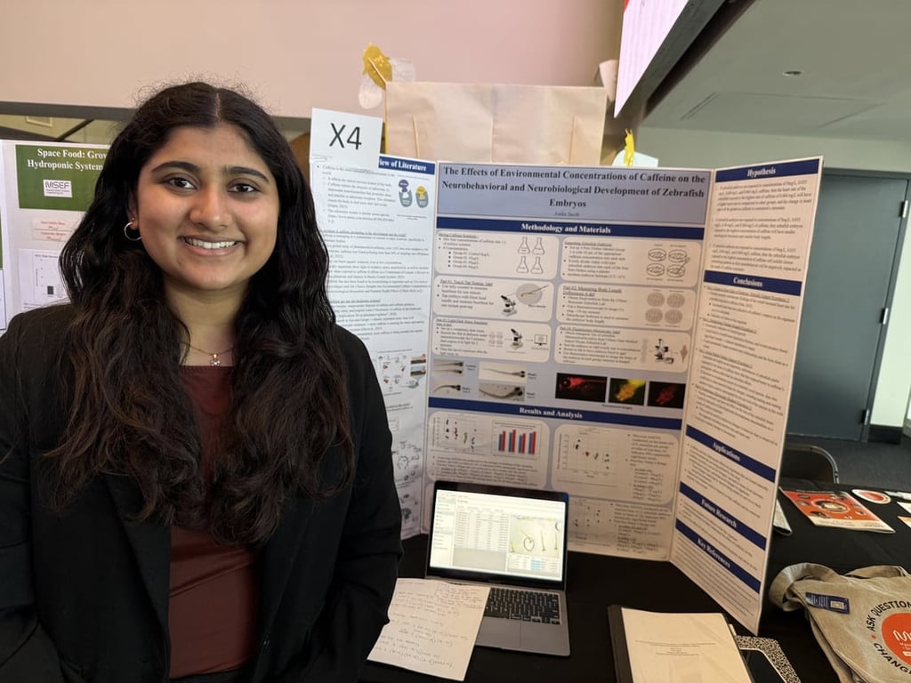 - Grade 11 student Anika Jacob presented her project, “The Effects of Environmental Concentrations of Caffeine on the Neurobehavioral and Neurobiological Development of Zebrafish Embryos.” After receiving a first-place award at the regional fair, Jacob earned a second-place award at the state fair. In the fall, Jacob was selected as a Marjot Foundation Scholar for her project proposal and was awarded a Marjot Foundation grant to use for her project.