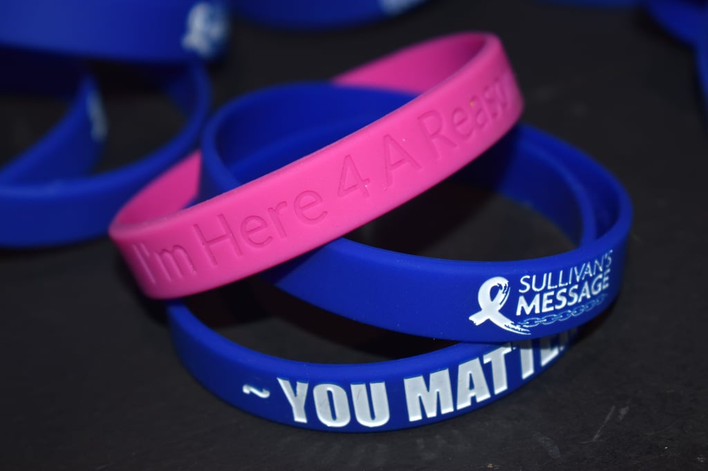 Following the presentation, students were given pink and blue bracelets. The pink one carries the message “Taylor Lee Meyer” and “I’m Here 4 A Reason,” while the blue one makes a statement, “Sullivan’s Message” and “YOU MATTER. (Photo Courtesy Old Rochester Regional School District and MA Superintendency Union #55)