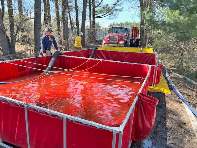 It took firefighters from 14 mutual aid communities using nine tanker trucks and six brush trucks about an hour to surround the fire, and about an hour to bring it under control. Companies remained on scene until Sunday afternoon.