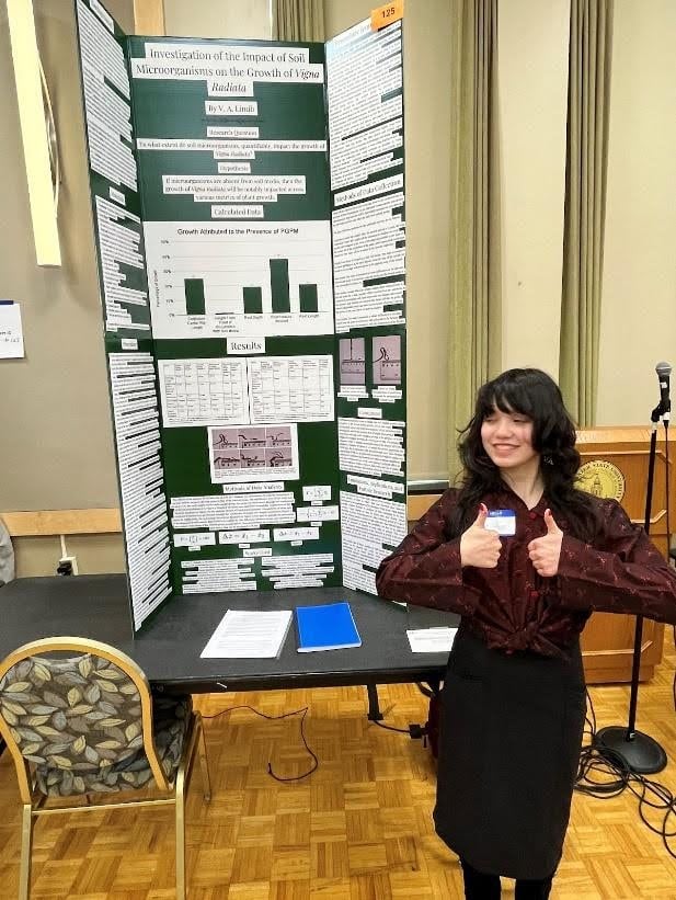 Southeastern Regional Vocational Technical High School student Valerie Lindh earned a third-place award for her science project, “Investigation of the Impact of Soil Microorganisms on the Growth of Vigna Radiata,” during the Massachusetts Region V Science & Engineering Fair at Bridgewater State University on March 8. (Photo courtesy Southeastern Regional School District)