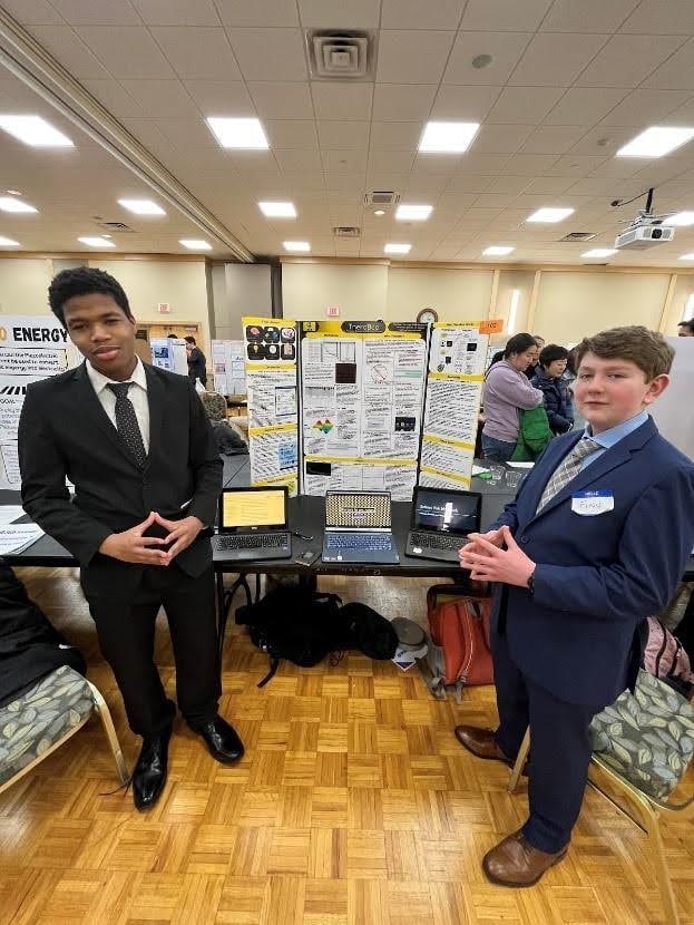 Southeastern Regional Vocational Technical High School students Olutayo Oyewusi and Finnegan Sommer earned third-place awards for their science project, “TheraBee: Revolutionizing Mental Health Care Through AI-Driven Detection and Personalized Support,” during the Massachusetts Region V Science & Engineering Fair at Bridgewater State University on March 8. (Photo courtesy Southeastern Regional School District)