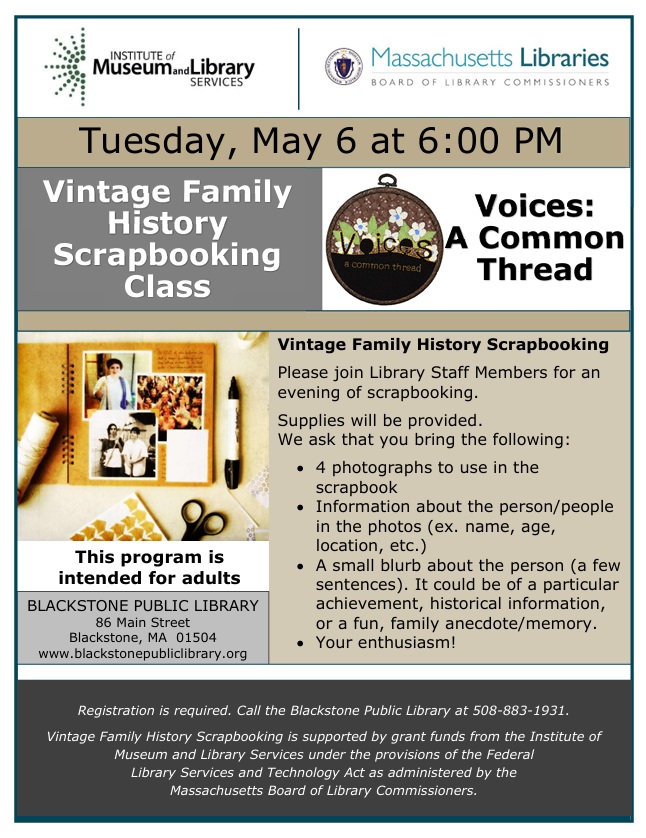Scrap your other plans for the evening. A family history scrapbooking class is being held at 6 p.m. on Tuesday, May 6, at the Blackstone Public Library. This is an opportunity to create beautiful scrapbooks, meant to preserve memories and family history. Guests at this Blackstone Public Library event are asked to bring at least four photographs each to use in the scrapbook, along with information about the subject. The rest of the supplies will be provided by library staff.