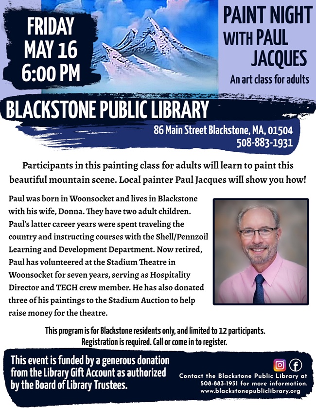 This art class, aimed at adults, is offering the chance for participants to take their painting skills to new heights. Instructor Paul Jacques is teaching guests how to paint a mountain. Jacques, a Blackstone resident, is the hospitality director for the Stadium Theatre in Woonsocket, the community where he grew up. This scenic painting class is being funded by a generous donation from the Library Gift Account, as authorized by the Board of Library Trustees. The paint class is for Blackstone residents only. Registration is required and limited to 12 participants. Call the Blackstone Public Library for more information or to register.