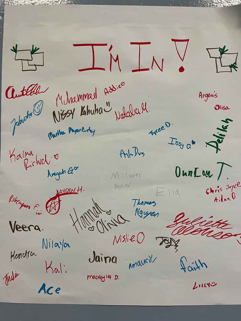 Students wrote their names on a poster to mark their participation in Blue Hills Regional Technical School’s third-ever Teen Speak Out. (Photo courtesy Blue Hills Regional Technical School)