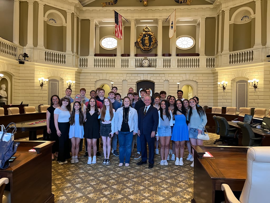 The Franklin High School cheerleading and boys basketball teams were both recognized for winning state championship titles during an honorary visit to the State House on Wednesday, April 30. (Photo Courtesy Franklin Public Schools)