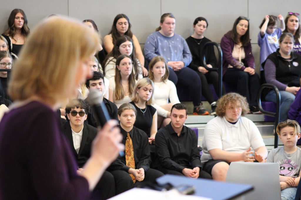 The event’s Keynote Speaker, Col. Michael C. Kelley, Commander of the 102nd Mission Support Group at Otis Air National Guard Base on Joint Base Cape Cod, addressed the purpled-up crowd. (Photo Courtesy Bourne Public Schools)