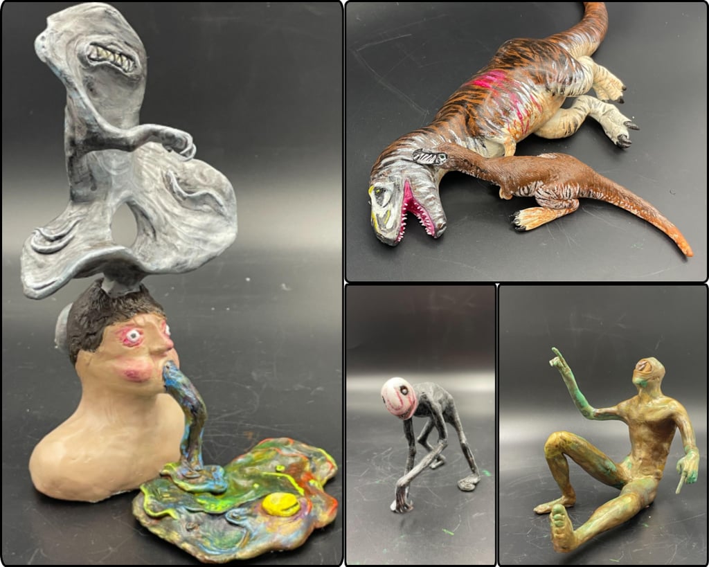 The artworks of Gio DeSouza, including “What Goes on Inside Gio” (left), “66 Million Years of Grief (top, right), “Loss of Direction” (bottom, right), and “Mr. Smile” (bottom, center). (Photo Courtesy Old Rochester Regional School District and MA Superintendency Union #55)