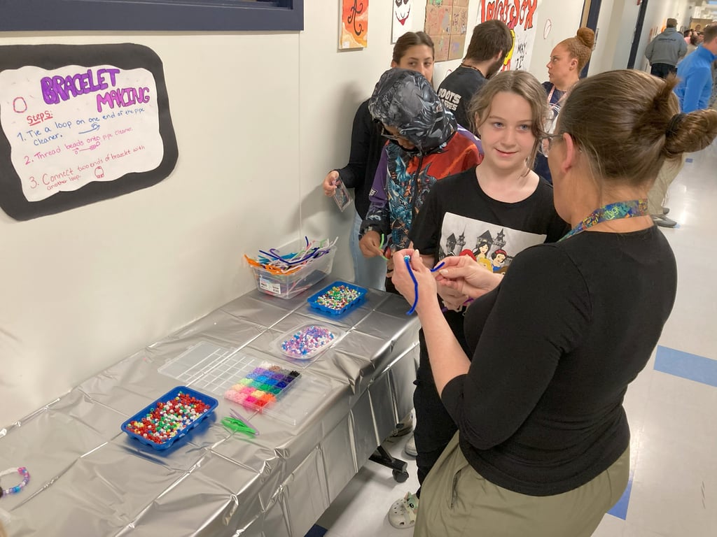 A teacher worked with students at a bracelet-making station during the second annual Art Showcase held by the Central Massachusetts Collaborative. (Photo Courtesy Central Massachusetts Collaborative)