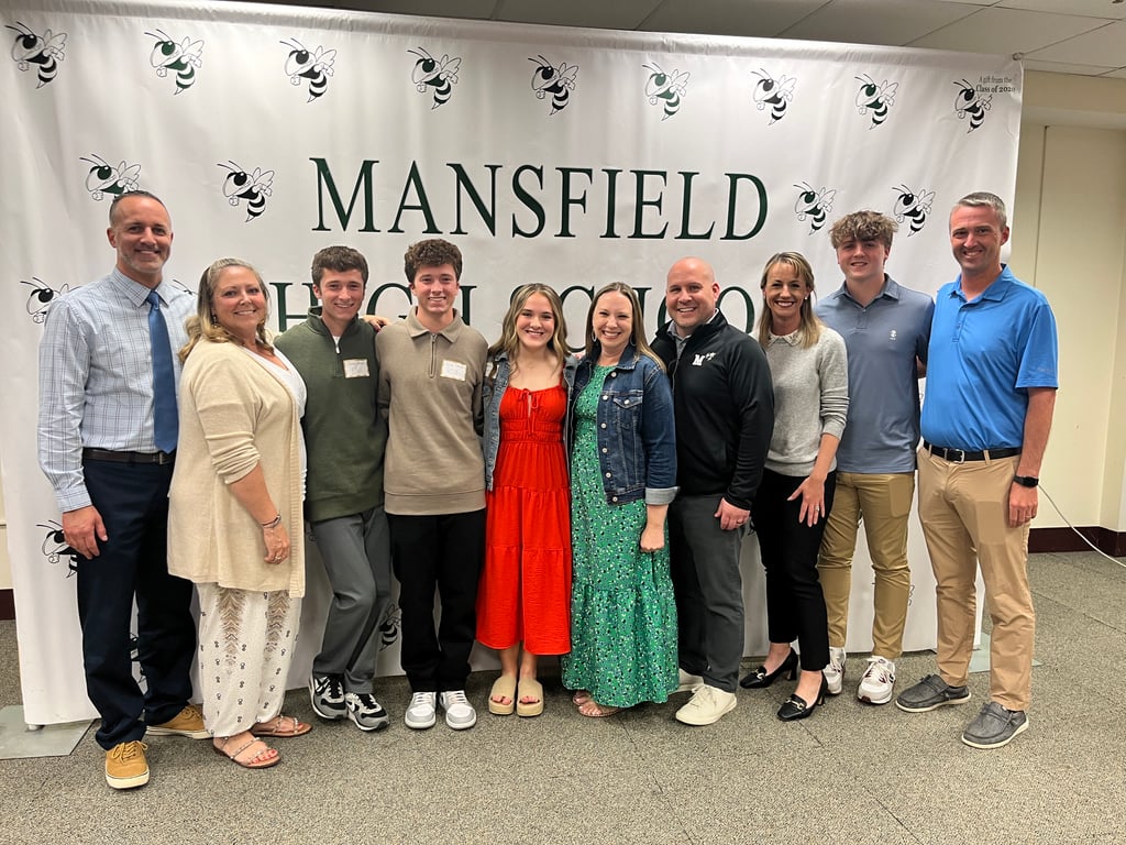 This year, four of the future educators have parents who work in the Mansfield Public Schools as teachers or administrators. They posed for a group photo with their parent-educators after the May 20 ceremony. (Photo Courtesy Mansfield Public Schools)