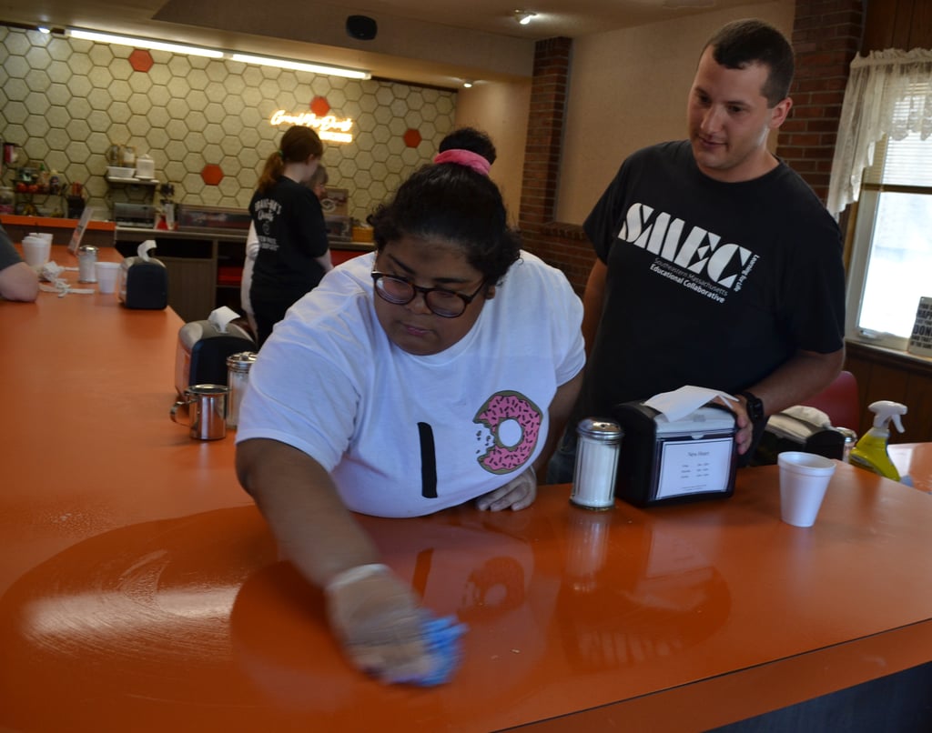 Under the watchful eye of Will Hoffman, her teacher at SMEC, Jaitzy Burgos wiped down a counter after a customer finished their donut and coffee and left the shop. (Photo Courtesy Southeastern Massachusetts Educational Collaborative)
