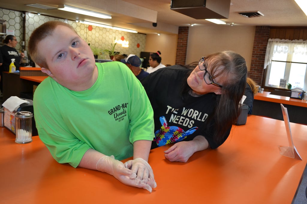Good friends of the shop’s owners, Hildie Aguiar and her son Brayden, also participated during a recent job shadowing day at GrandMa’s Donuts. (Photo Courtesy Southeastern Massachusetts Educational Collaborative)