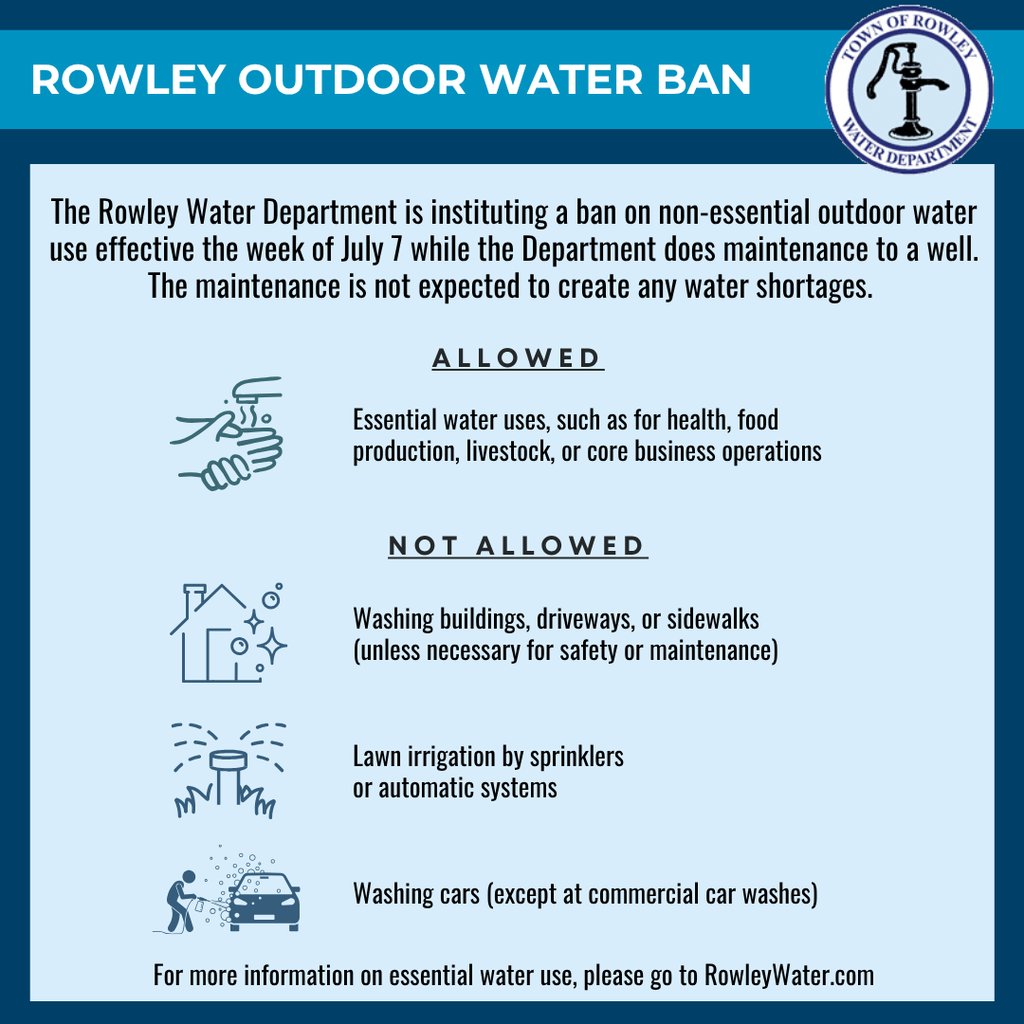ROWLEY – The Rowley Water Department is issuing a ban on all non-essential outdoor water use during the week of July 7.