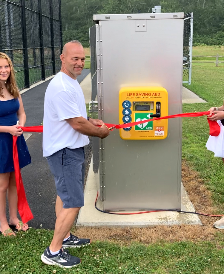 Richard Burns, a North Attleborough firefighter who suffered cardiac arrest and was resuscitated by colleagues on Sept. 11, 2023, cut the ribbon to celebrate a new outdoor AED unit near the backstop at Norton Veterans Memorial Field in back of Norton High School. (Photo Courtesy Norton Fire Department)