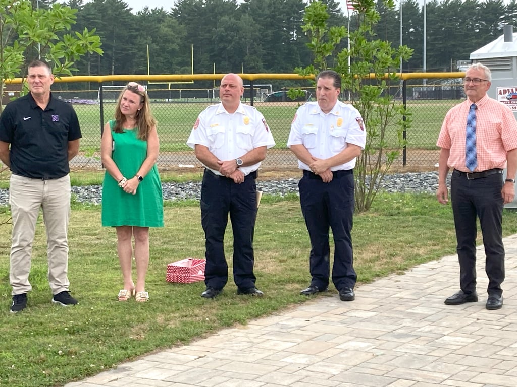 From left to right, Norton Public Schools Director of Facilities Wade Lizotte, Superintendent Jennifer O’Neil, Fire Chief Shawn Simmons, Deputy Fire Chief Michael Wilson, and Selectman Roger Marsan. (Photo Courtesy Norton Fire Department)