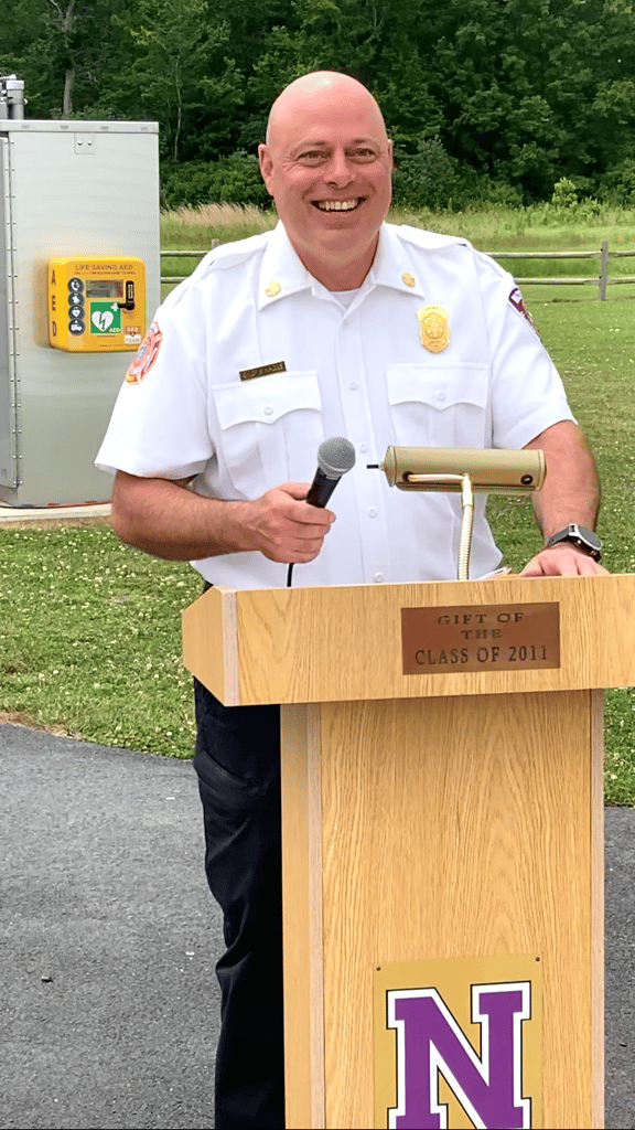Norton Fire Chief Shawn Simmons spoke during a ribbon cutting ceremony at Norton Veterans Memorial Field in back of Norton High School to celebrate eight new outdoor AED units that have been installed throughout the Town of Norton, with a ninth unit scheduled to be in place soon. (Photo Courtesy Norton Fire Department)