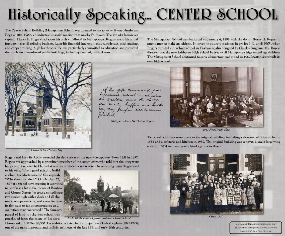 The new panel at the Center School describes how the building opened in 1899, when it was first known as the Mattapoisett School. The property was donated to the town by an industrialist and financier from Fairhaven named Henry Huttleston Rogers.