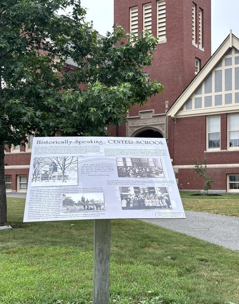 The 36-inch-wide, 30-inch-high panel sits on a metal beam planted into the ground, telling the story of the Center School’s founding, including pictures provided by the Mattapoisett Historical Society that depict the building’s early days. The panel, with the title “Historically Speaking … Center School,” also includes an image of a handwritten note from the philanthropist who funded the construction of the building, describing his intentions to provide the property to the town so that “the children are made happier and healthier.”