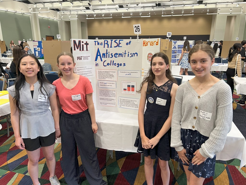 A group of Thomas Blake Middle School eighth graders did their civics project on the topic of “The Rise of Antisemitism in Colleges.” From left to right, Abby Joehanes, Lucy Cooprider, Anna Feldman, and Maddie Unger. (Medfield Public Schools)