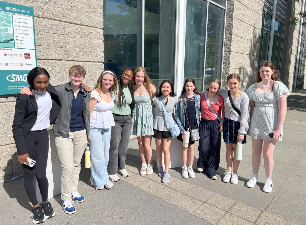 From left to right, Vai Sahukar, Finn Harvey, Ava Tosches, Brielle Dhaiti, Leah Whitcher, Abby Joehanes, Anna Feldman, Lucy Cooprider, Maddie Unger and, the group’s civics project student leader from Medfield High School, Bridie Sullivan. (Medfield Public Schools)