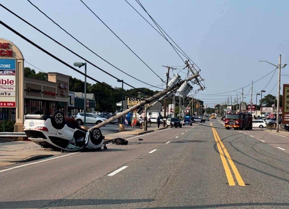 Upon arrival, firefighters found a single vehicle resting on its roof and three snapped utility poles.