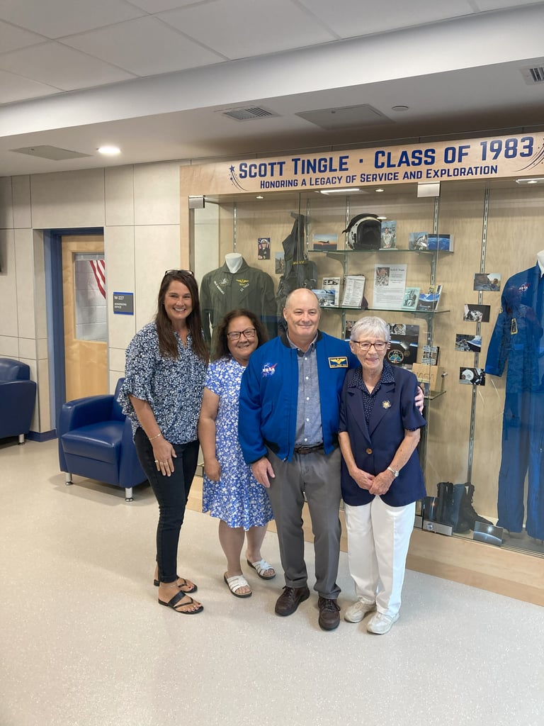 Astronaut Scott Tingle was joined for the unveiling of the display case by several members of his family. From left to right, Maureen Tingle, Raynette Tingle, Scott Tingle and Sheila Tingle. (Photo Courtesy Blue Hills Regional Technical School)