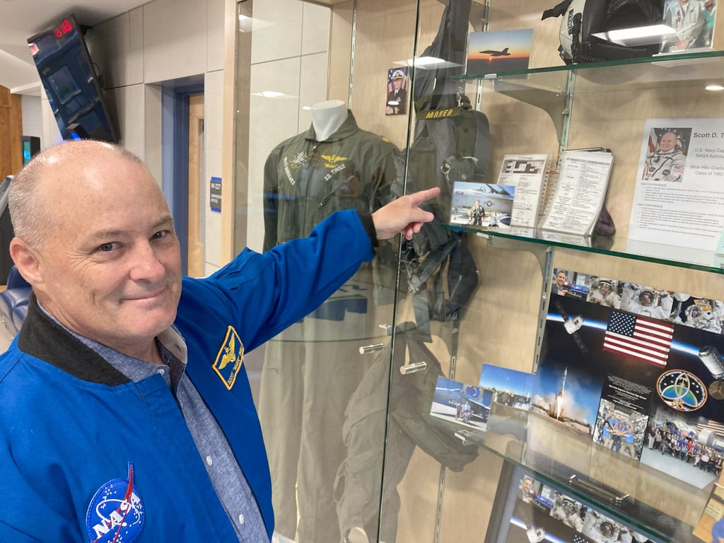 Astronaut Scott Tingle said he was honored by the new display in the lobby of Blue Hills Regional Technical School, which contains pictures, flight suits, boots and a helmet from his career in the military and in NASA. (Photo Courtesy Blue Hills Regional Technical School)