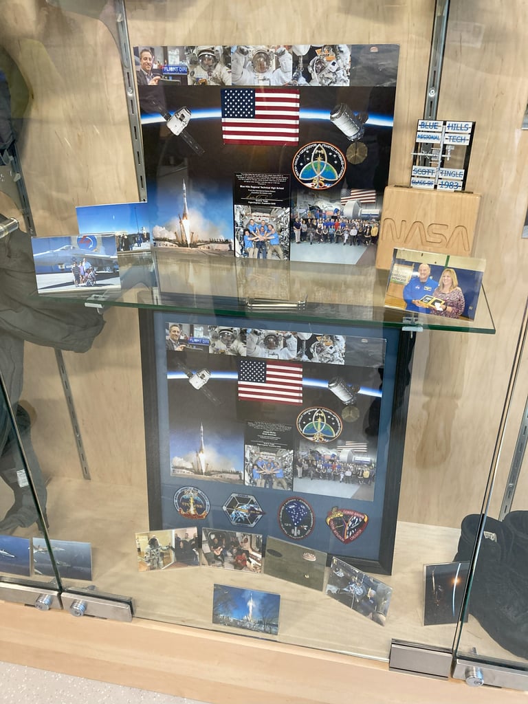 The display case features a collection of photographs from Scott Tingle’s time working on the International Space Station. (Photo Courtesy Blue Hills Regional Technical School)