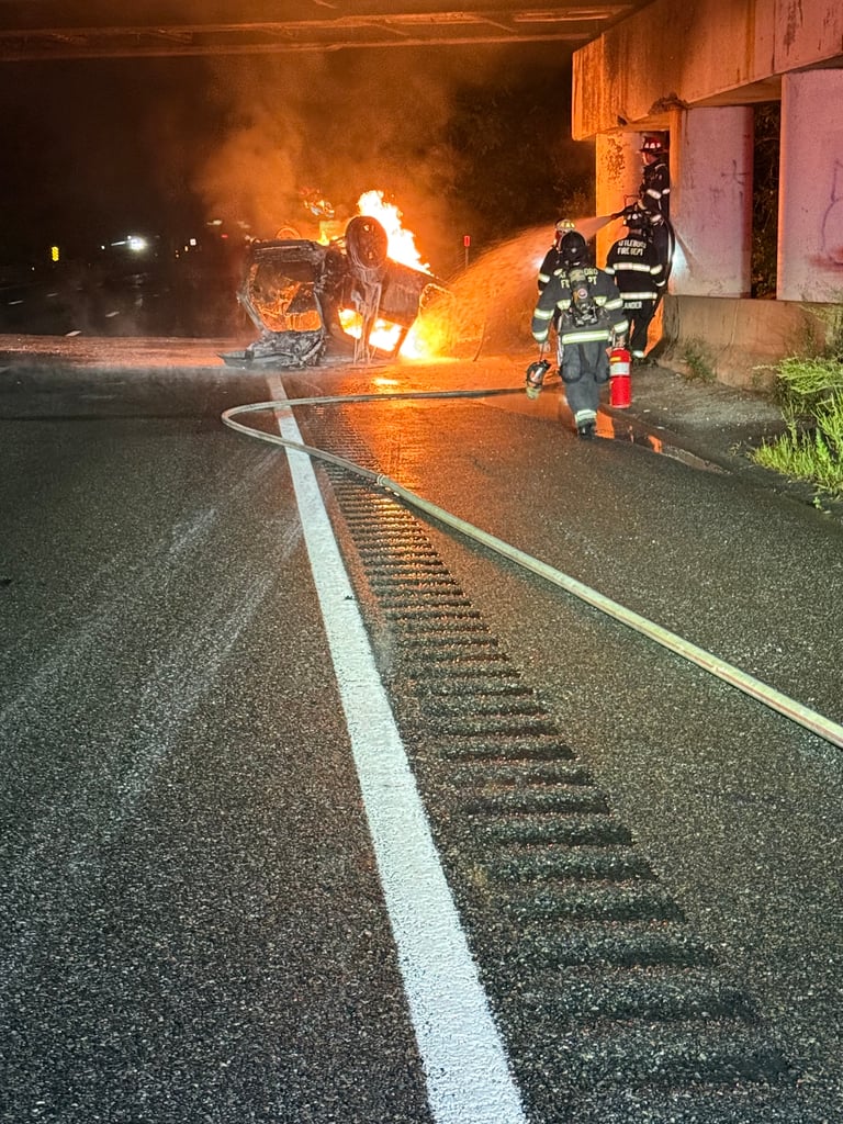 The overturned vehicle that caught fire after colliding with another car, and then a bridge support on I-95 north early Sunday morning. (Photo Courtesy Attleboro Fire Department)