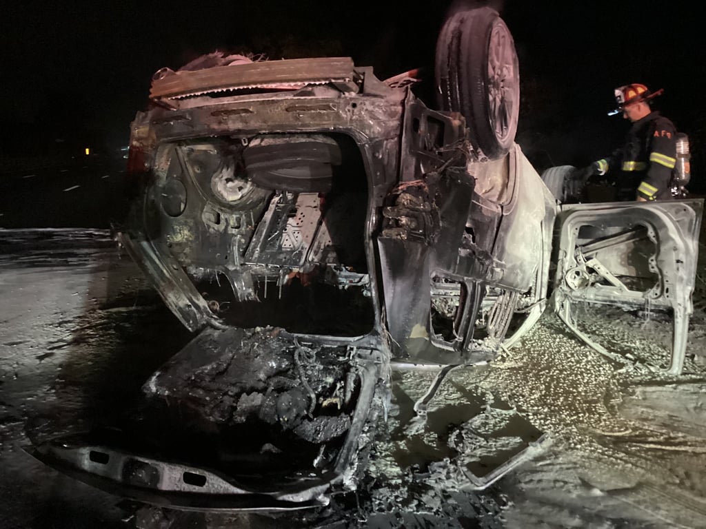 The second vehicle came to rest about 400 yards away after rolling over and striking a bridge support. The car was fully engulfed in flames beneath the overpass. Firefighters quickly extinguished the fire.