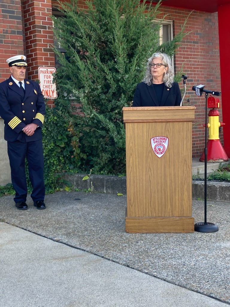 Attleboro Mayor Cathleen DeSimone reminded the audience of those 343 “incredibly brave firefighters” who went into the World Trade Center in New York City and lost their lives in the line of duty on Sept. 11, 2001. (Photo Courtesy Attleboro Fire Department)