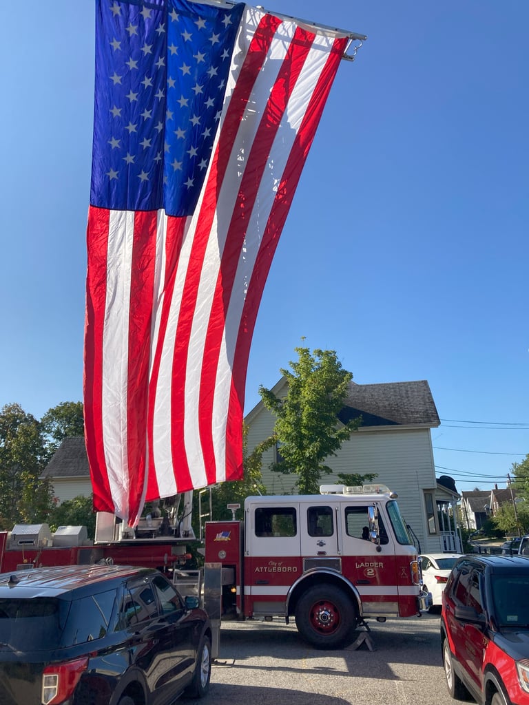 A massive American flag was hoisted up by a ladder truck during the annual Sept. 11 Remembrance Ceremony held on Thursday morning outside the Attleboro Fire Department Headquarters. (Photo Courtesy Attleboro Fire Department)