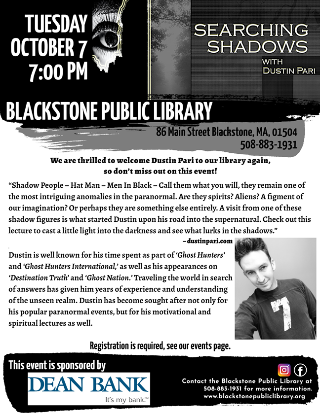 - MORE INFO: Registration is required. Visit the events page at blackstonepubliclibrary.org or call 508-883-1931 to sign up. This event is sponsored by Dean Bank.