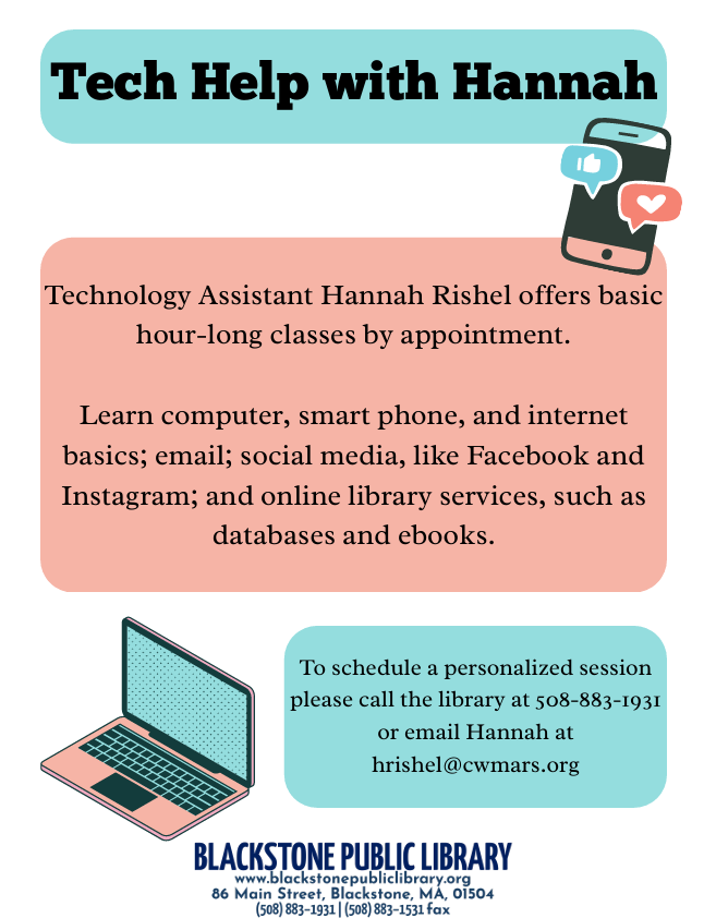 - MORE INFO: Classes are by appointment only and can be scheduled by calling the Blackstone Public Library at 508-883-1931 or by emailing Technology Assistant Hannah Rishel at hrishel@cwmars.org.