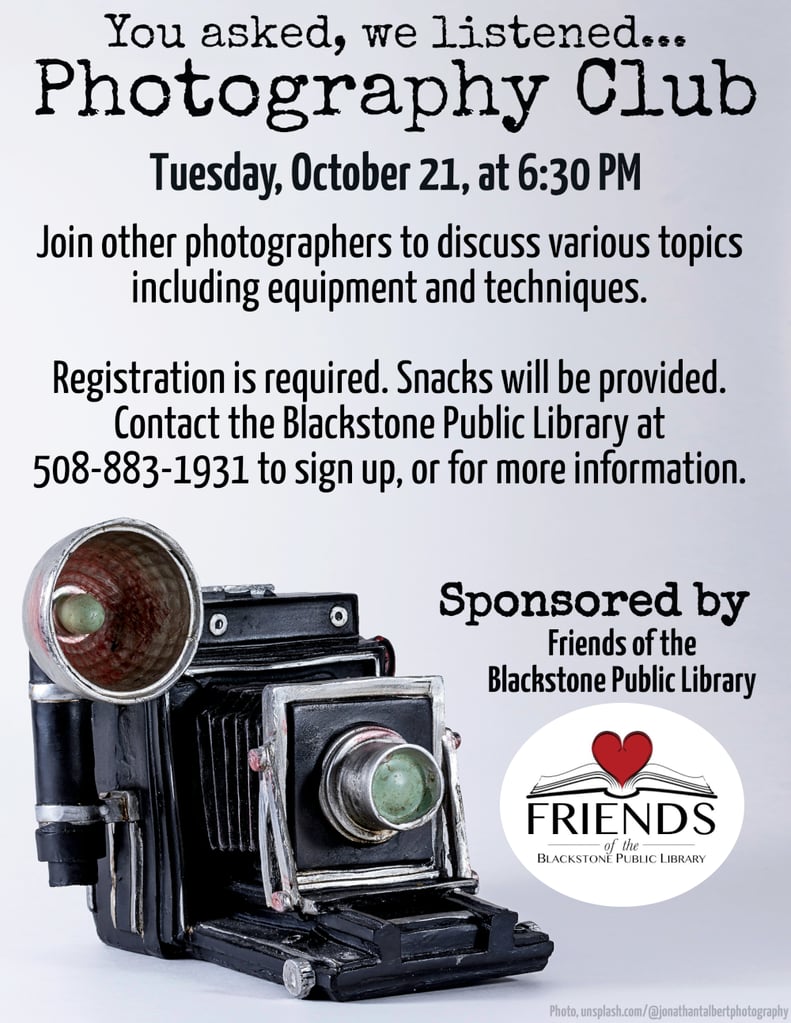 Join other photographers to discuss various topics, including equipment and techniques. Each month, the Blackstone Photography Club hosts a guest speaker, exploring all things photography-related and providing special insight into the craft. Snacks will be provided.