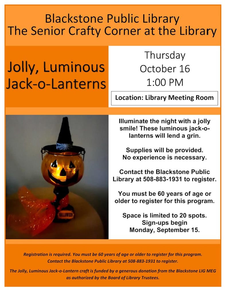 Light up your autumn with a little creativity on Thursday, Oct. 16, at 1 p.m. Seniors are invited to the Library Meeting Room to make Jolly, Luminous Jack-o-Lanterns.
