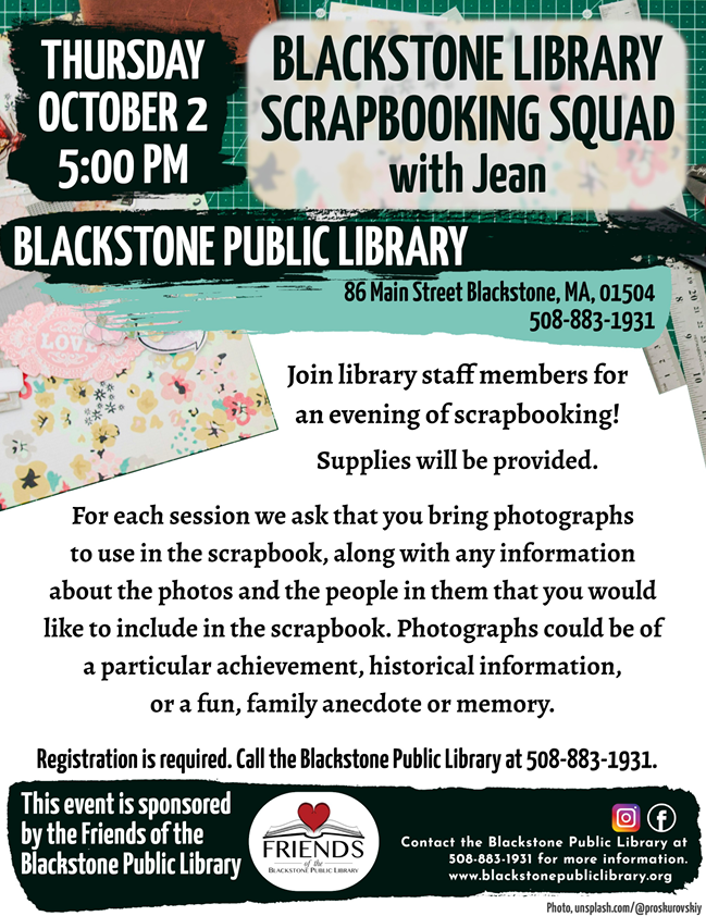 Scrap your other plans for the evening. A family history scrapbooking class is being held at 5 p.m., Thursday, Oct. 2, at the Blackstone Public Library. This is an opportunity to create beautiful scrapbooks, meant to preserve memories and family history. Guests at this Blackstone Public Library event are asked to bring at least four photographs each to use in the scrapbook, along with information about the subject. The rest of the supplies will be provided by library staff.