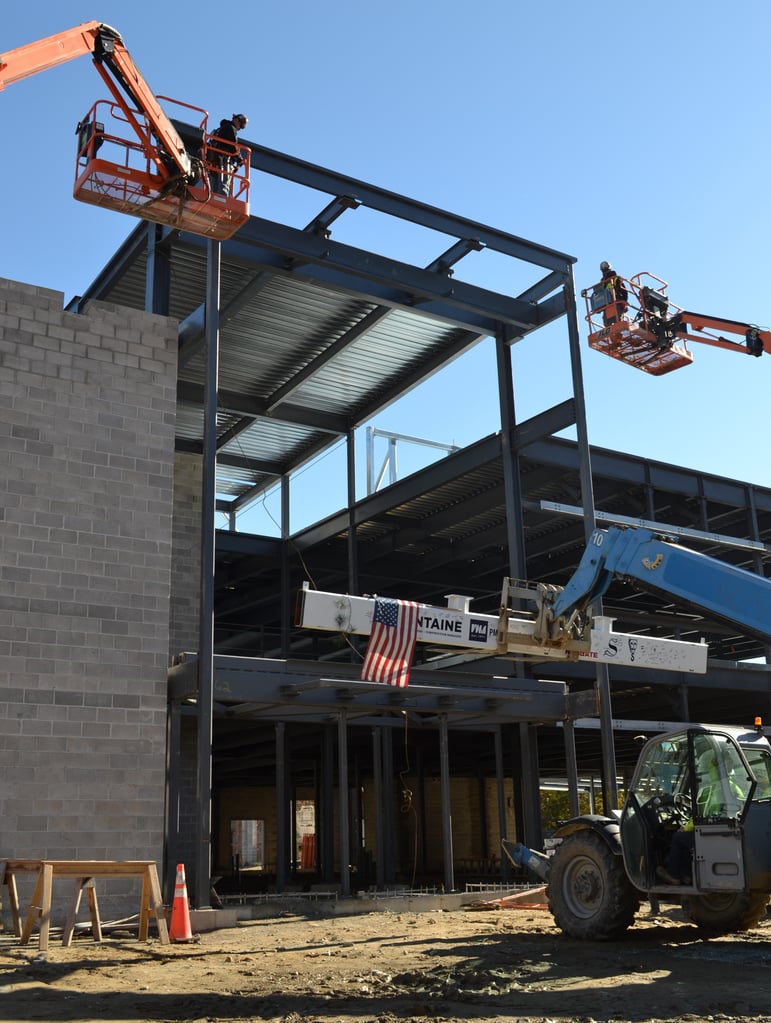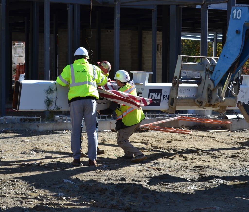 Construction workers fastened an American flag to the beam that topped off the future Public Safety and Public Works Complex on Depot Street. (Photo Courtesy Easton Police Department)