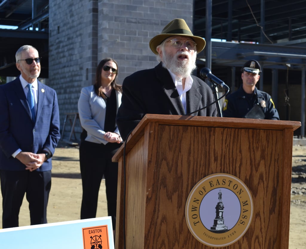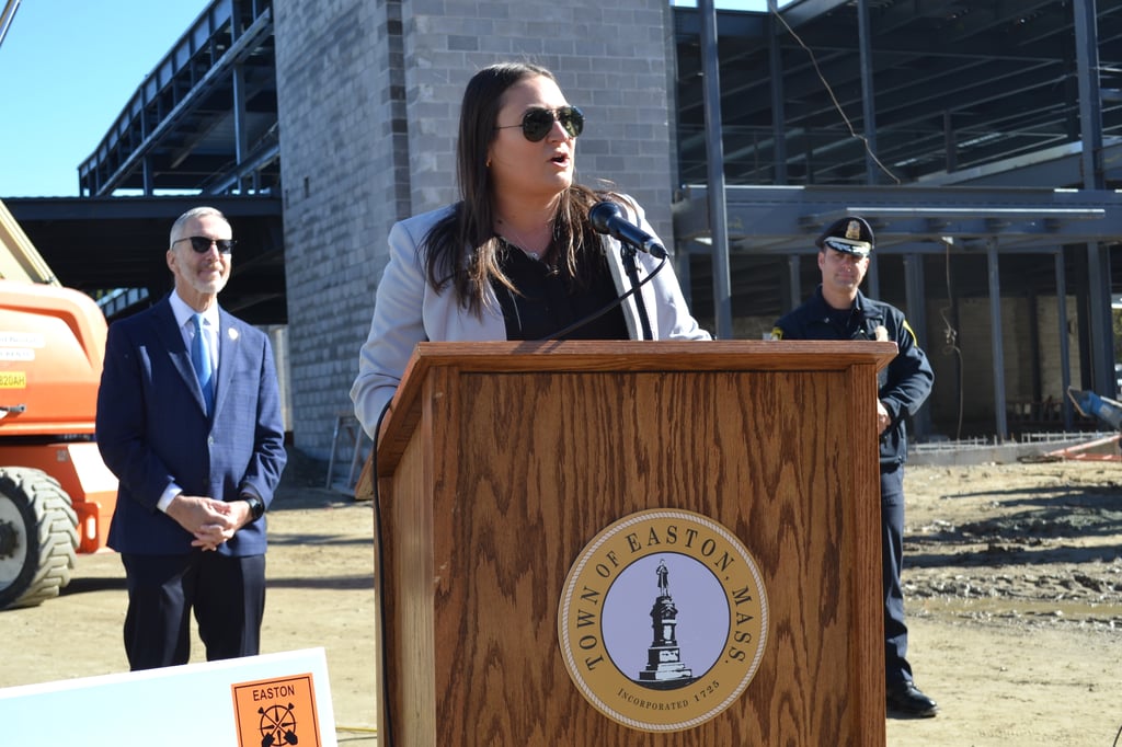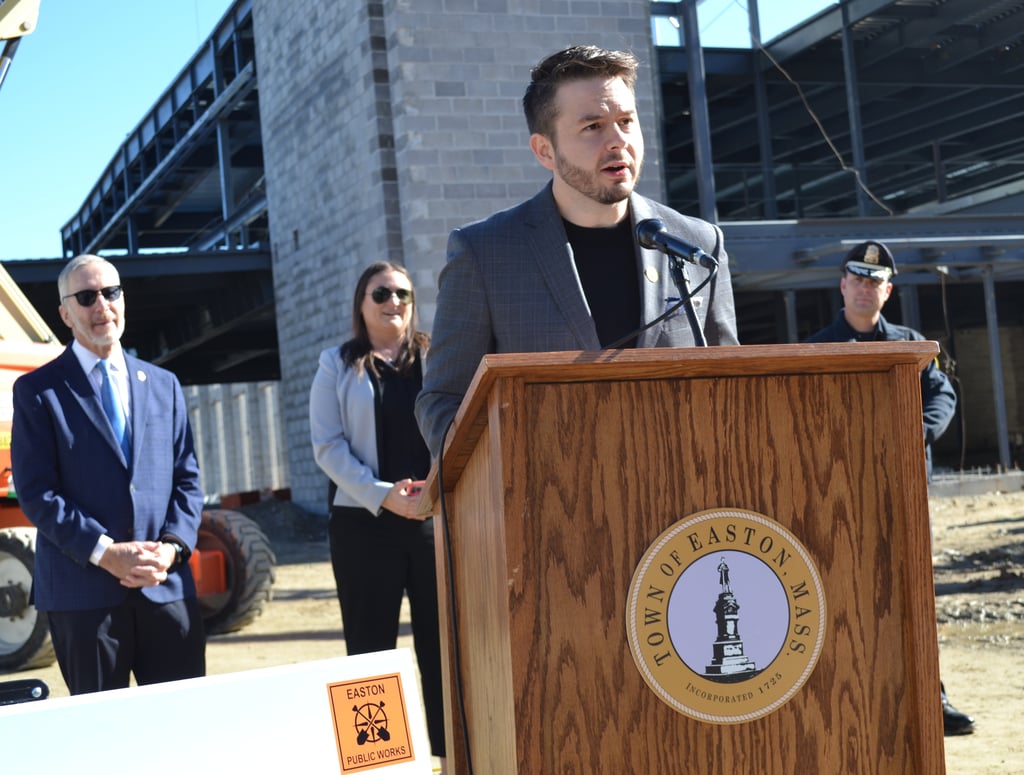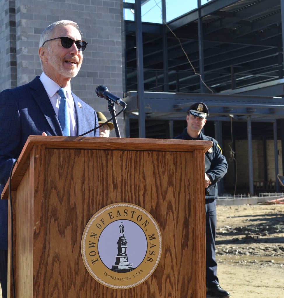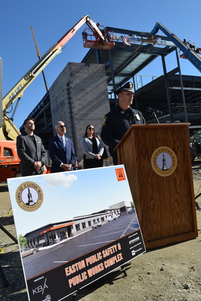 Chief Boone was joined at the lectern by Easton Town Administrator Connor Read, Easton Select Board Vice Chair Craig Barger, state Rep. Bridget Plouffe and U.S. Rep. Stephen F. Lynch. Fire Chief Justin Alexander and DPW Director David Field, whose departments will have a new home at the location, were also in attendance.
