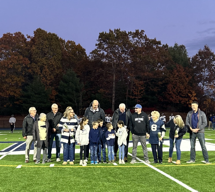 The Hanlon family joined the festivities Oct. 24, taking their place on the 50-yard line to begin the rededication ceremony for Hanlon Field. (Photo Courtesy Medway Public Schools)