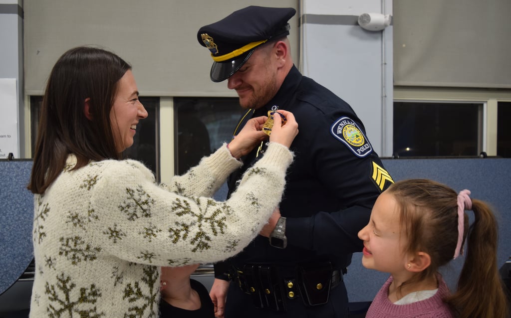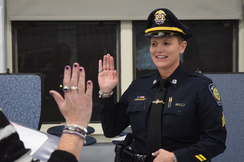Officer Brian Pratt and Officer Marissa DeLucia were sworn in as new full-time police officers, while Officers Bart Connors and Michelle Princi were sworn in as new sergeants.
