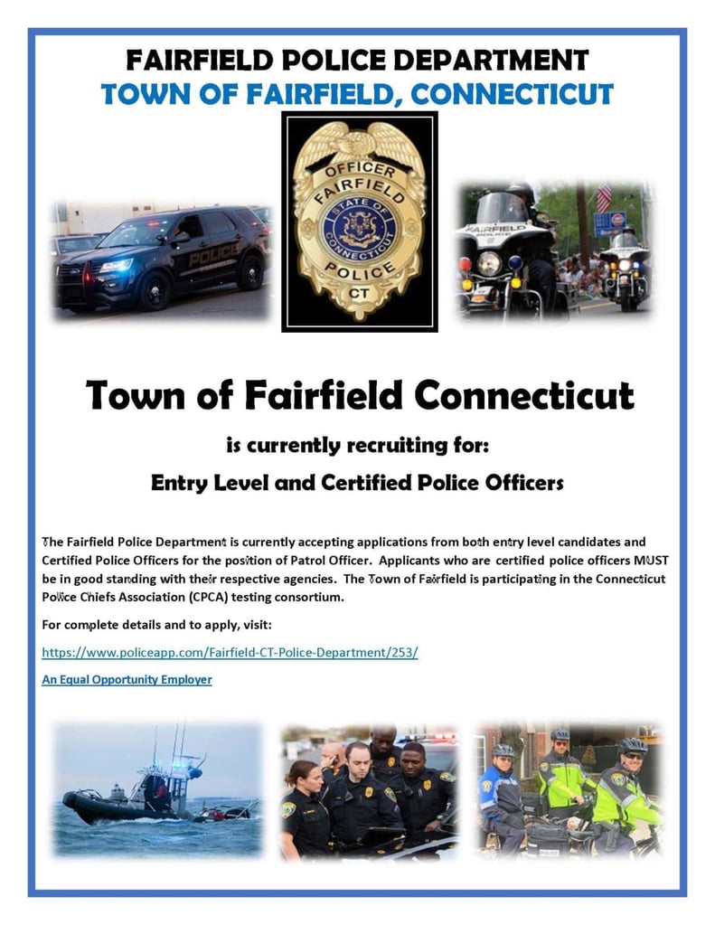 The department is currently accepting applications for both positions. Applicants who are certified police officers must be in good standing with their respective agencies. The Town of Fairfield is participating in the Connecticut Police Chiefs Association’s testing consortium as an initial screening for application.