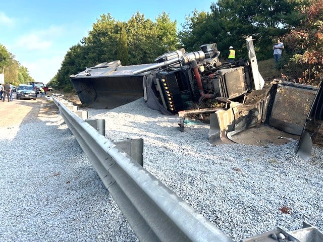 A dump truck filled with gravel overturned and on Interstate 495 Southbound on Tuesday morning,…