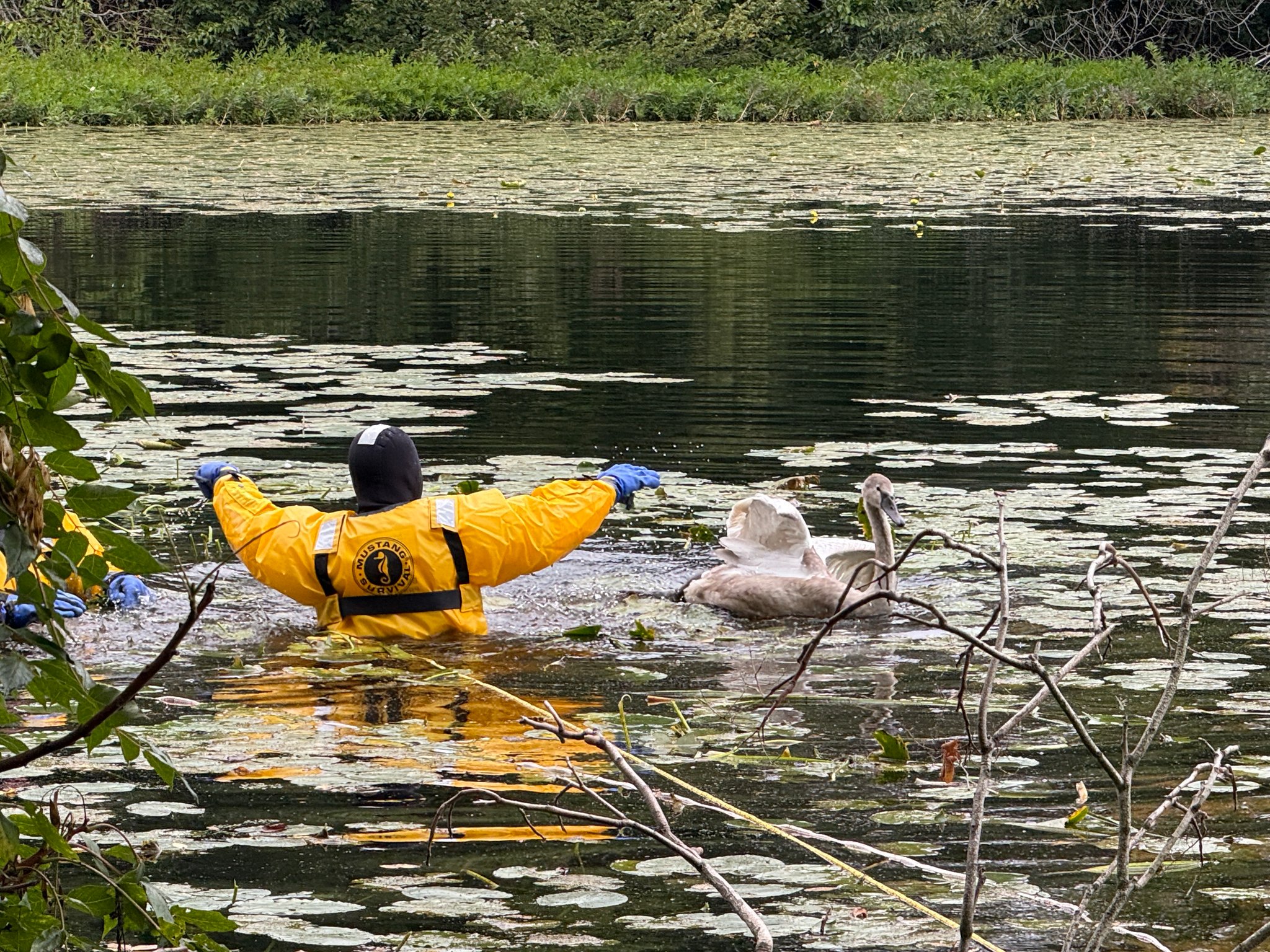An Attleboro firefighter donning a water rescue suit wades into Cranberry Pond to help free…