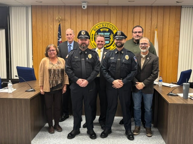 Blackstone Police Officer Brendan Fitzpatrick, far left, and Officer Eric Lawler, far right, both received…