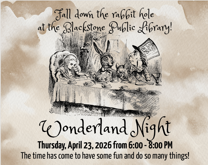 BLACKSTONE — The Blackstone Public Library is pleased to announce that it is hosting two special events to celebrate National Library Week, including Wonderland Night…
