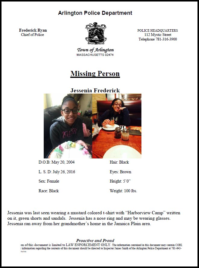 Arlington — Chief Frederick Ryan reports that the Arlington Police Department is actively searching for Jessenia Frederick, who has been missing since yesterday, and is seeking the public’s help in determining her whereabouts.  arlington jessenia