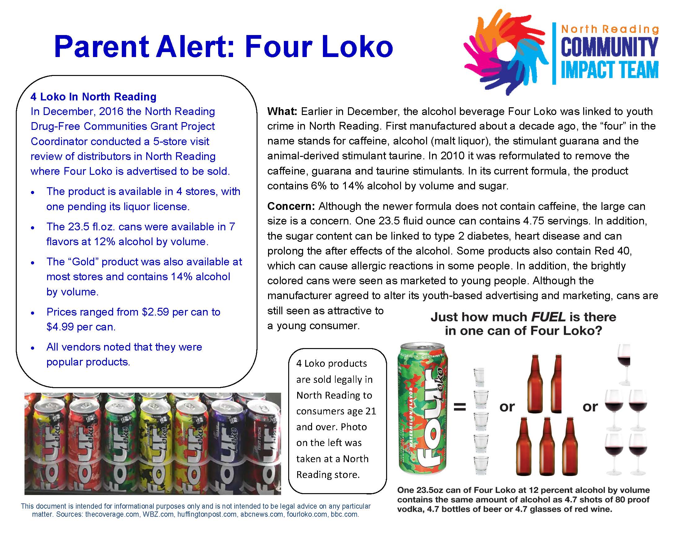 NORTH READING — Chief Michael P. Murphy and the North Reading Police Department, along with the North Reading Community Impact Team, are warning residents about the potential dangers of the alcoholic beverage Four Loko after the beverage has reappeared in stores with modified ingredients.