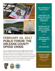 The Newport Police Department invites community members to a forum to address concerns and constructive solutions to the opioid crisis in Orleans County. The forum will include a presentation by law enforcement followed by a question and answer session. Members of various law enforcement councils and police officers will be available to speak with concerned citizens and help those in attendance understand how opiate addiction affects family members and friends.