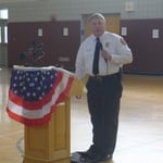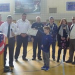 State Fire Marshal Ostroskey, Bedford Police Lt. James Graham, Bedford Firefighter Nick Anderson and Principal Rob Ackerman joined Chief Grunes in honoring Jacoby for his quick thinking after he used fire safety skills to evacuate his family from their home during a house fire in December.